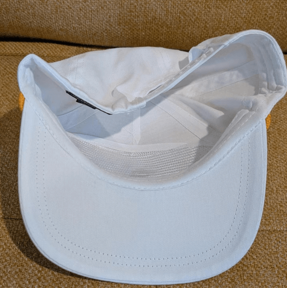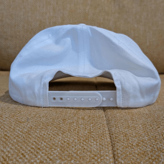 The Hat: White Cotton 5-Panel with Yellow Rope detail.