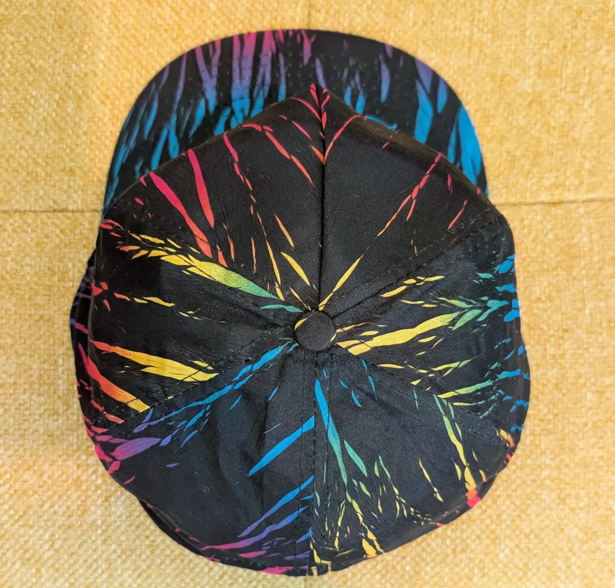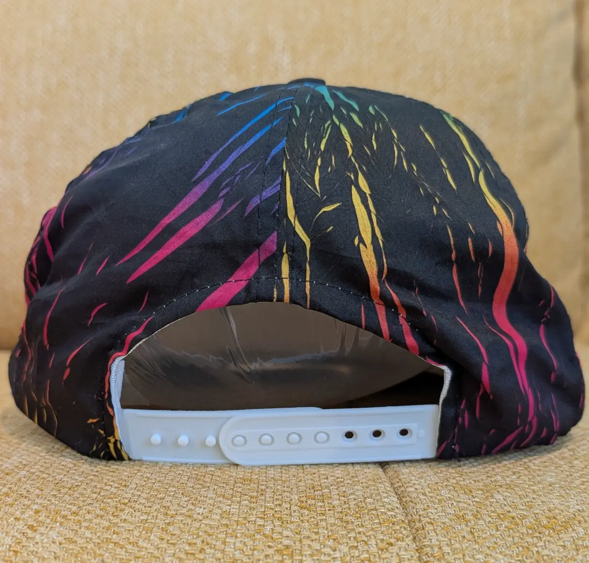 Design: Black base with vibrant neon pink, blue, and yellow abstract “lightning” print.